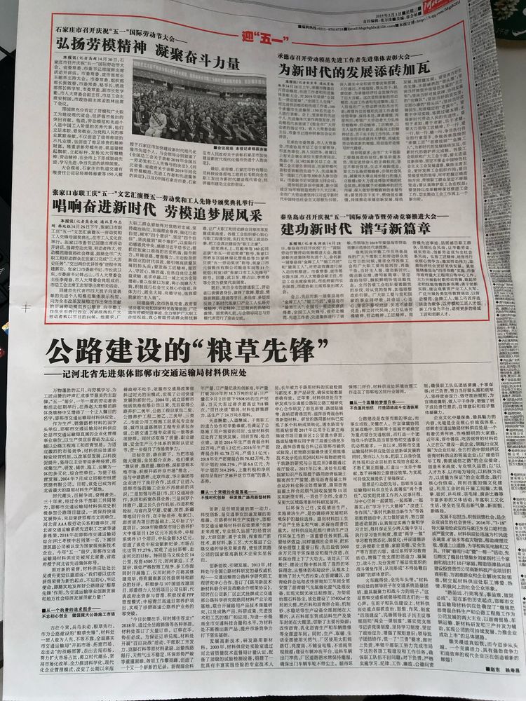 河北工人報(bào)“勞動(dòng)節(jié)”當(dāng)天的報(bào)紙上贊譽(yù)了這樣一個(gè)集體,他們從做強(qiáng)做大公路施工市場(chǎng)的追求起步;從研發(fā)推廣路用新型材料的命題落筆;從打造團(tuán)結(jié)戰(zhàn)斗交通鐵軍的夢(mèng)想升華。不忘初心、不愧時(shí)代、不負(fù)重托,創(chuàng)造了一個(gè)又一個(gè)生產(chǎn)的奇跡,這就是我們單位——邯鄲市交通運(yùn)輸局材料供應(yīng)處,被河北工人報(bào)譽(yù)為“公路建設(shè)的糧草先鋒”。